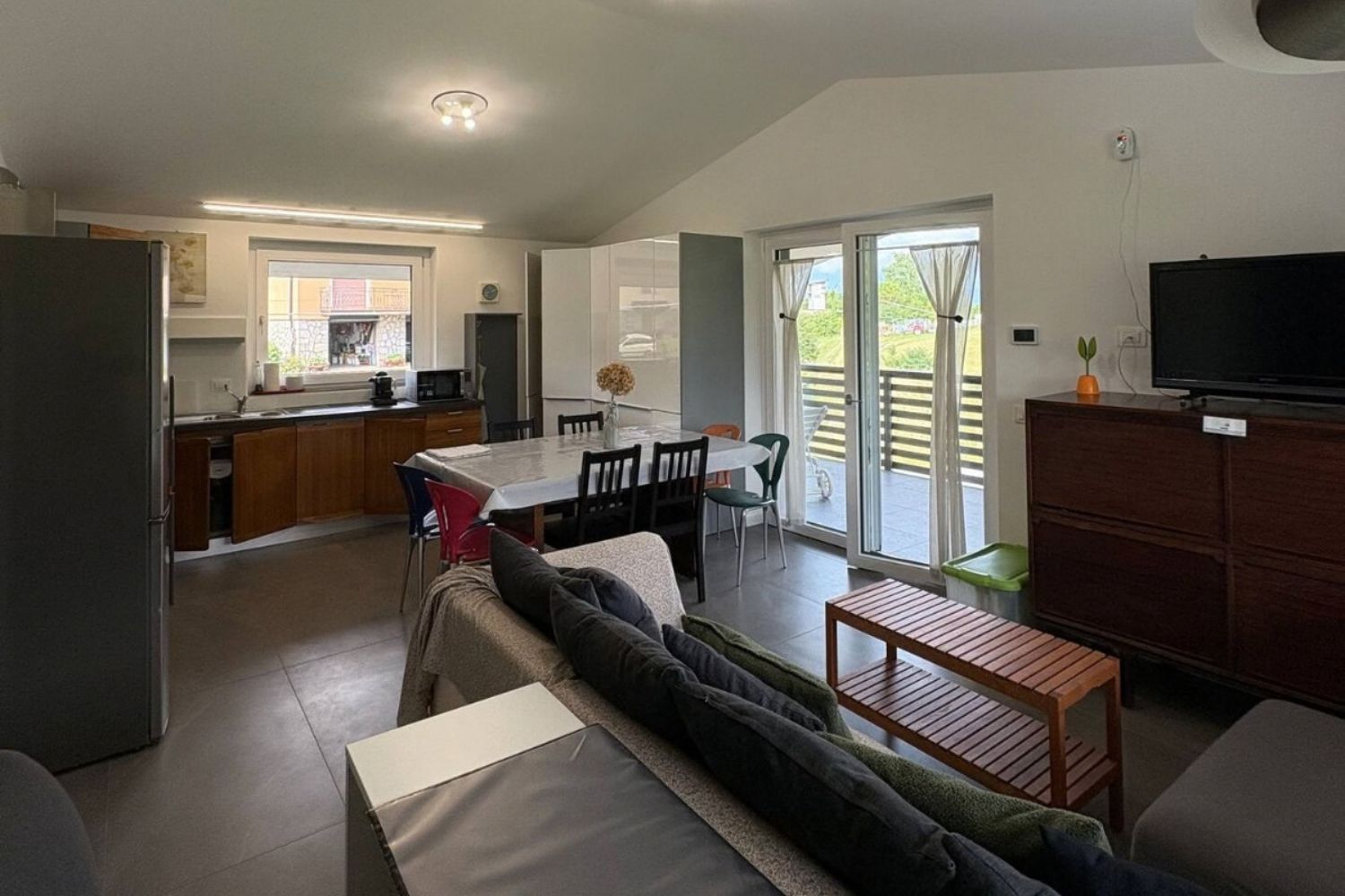 Grazioso appartamento moderno con open space, cucina attrezzata con lavastoviglie, microonde e bollitore, sala pranzo con divano e TV, e...